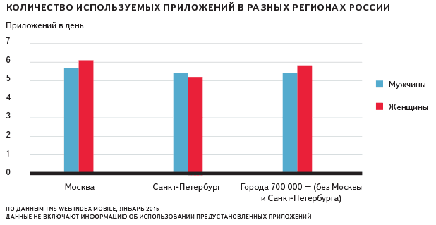 Когда люди используют мобильные устройства для выхода в Интернет, они получают информацию не только с сайтов, но и через приложения. Количество приложений, которые люди используют на смартфонах и планшетах в течение дня, примерно одинаково во всех крупных городах – в среднем пять или шесть.