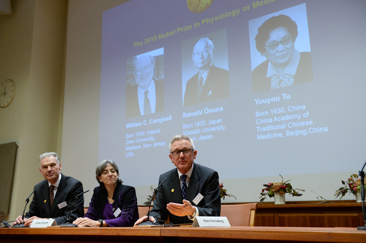 Ее привыкли считать «премией по биологии»: темы прошлых лет — везикулы, теломераза, плюрипотентные стволовые клетки. И тут в 2015 году в Нобелевском комитете как будто вспоминают, что в завещании Нобеля есть слово «медицина». И награждают за конкретные лекарства от конкретных тропических болезней. Уильям Кэмпбелл (Ирландия, 85 лет) и Сатоси Омура (Япония, 80 лет) придумали авермектин, универсальное средство от паразитов; Юю Ту (Китай, 84 года) нашла и описала артемизинин, препарат против малярии.