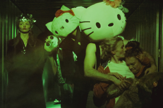 Иногда сценическая и экранная реальности взаимопроникают: выстрел звучит на сцене, а пятно крови растекается на экране. Но ничто не дает основания утверждать, что одно есть производное другого, чей-то психоделический трип. В заэкранье проникают зловещие фигуры маскарада с головами чебурашек и Hello Kitty — чтобы покончить с Леди Макдуф. Иногда тот или иной персонаж будто стремится покинуть металлическое чрево ангара, приближается к камере, словно стараясь выйти за «рамку» кадра. Вот Леди Макдуф (Гала Самойлова), прижимая к себе ребенка, приближается к краю экрана, в то время как на заднем плане — вакханалия масок. Мизансцена читается не только как попытка героини спастись, сбежать, но и как попытка «прорвать» экран, покинуть зону отчуждения… Эта тоска безнадежности, транслируемая онемевшим от ужаса телом, — то, что останется потом с нами, наперед знающими, что убийство вот-вот совершится, а девочку вырвут из спазматически сведенных рук. Знающими — но остающимися в положении пассивной созерцательности.