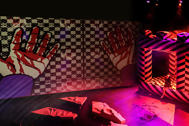 © Anastasia Blur По сцене же разгуливают костюмированные персонажи в кимоно и блестящих коронах из китайских полимеров. Леди Макбет с игрушечной собачкой в руках исполняет соло Гекаты. Прыгает на полосатом, как пограничный столб, батуте резвая массовка ведьм. Помахивает лапой гигантская манэки-нэко. Вторичность транслируется на разных художественных уровнях: стилизованные кимоно и самурайские мечи героев читаются не цитатой из «Трона в крови» Куросавы, но знаком маскарада, фейком made in China.