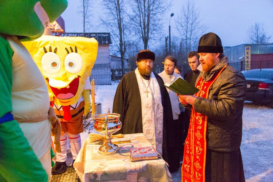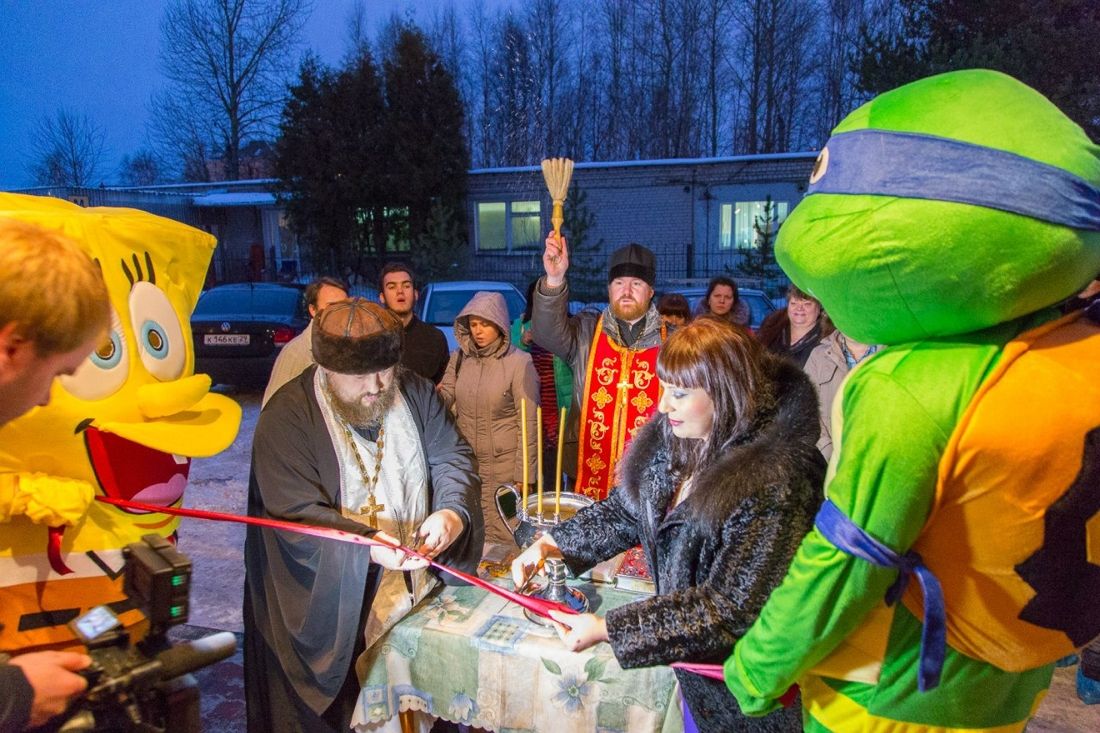 Открытие кафе в Северодвинске: священник режет ленточку, которую держат Губка Боб и Черепашка-ниндзя