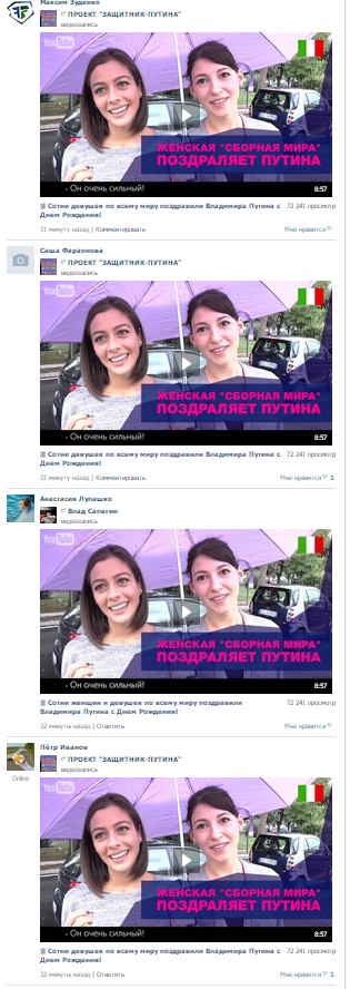 — крошка цейтнот (@Inga_Kudracheva) Twitter Патриотические группы во «ВКонтакте» массово распространяли видео кремлевского проекта «Сеть», на котором «сотни женщин и девушек по всему миру поздравили Владимира Путина».