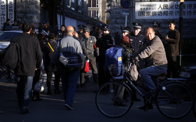 Мужчина проезжает на велосипеде мимо полицейских. Пекин.