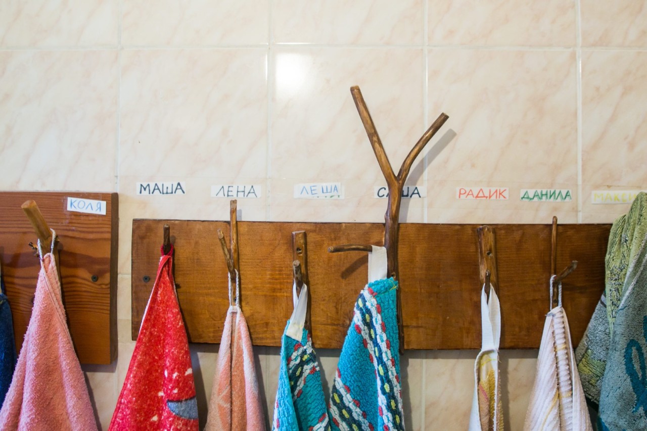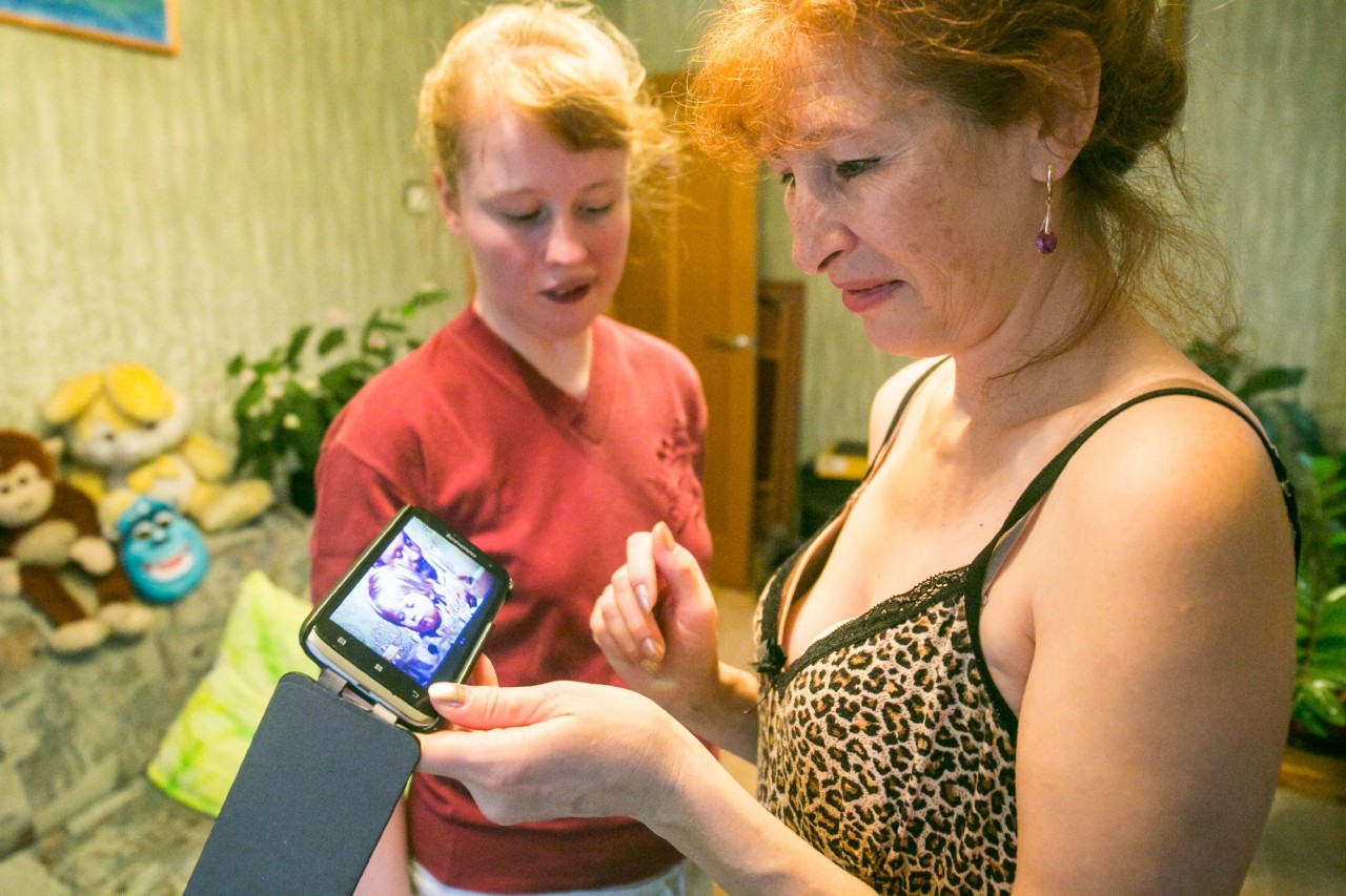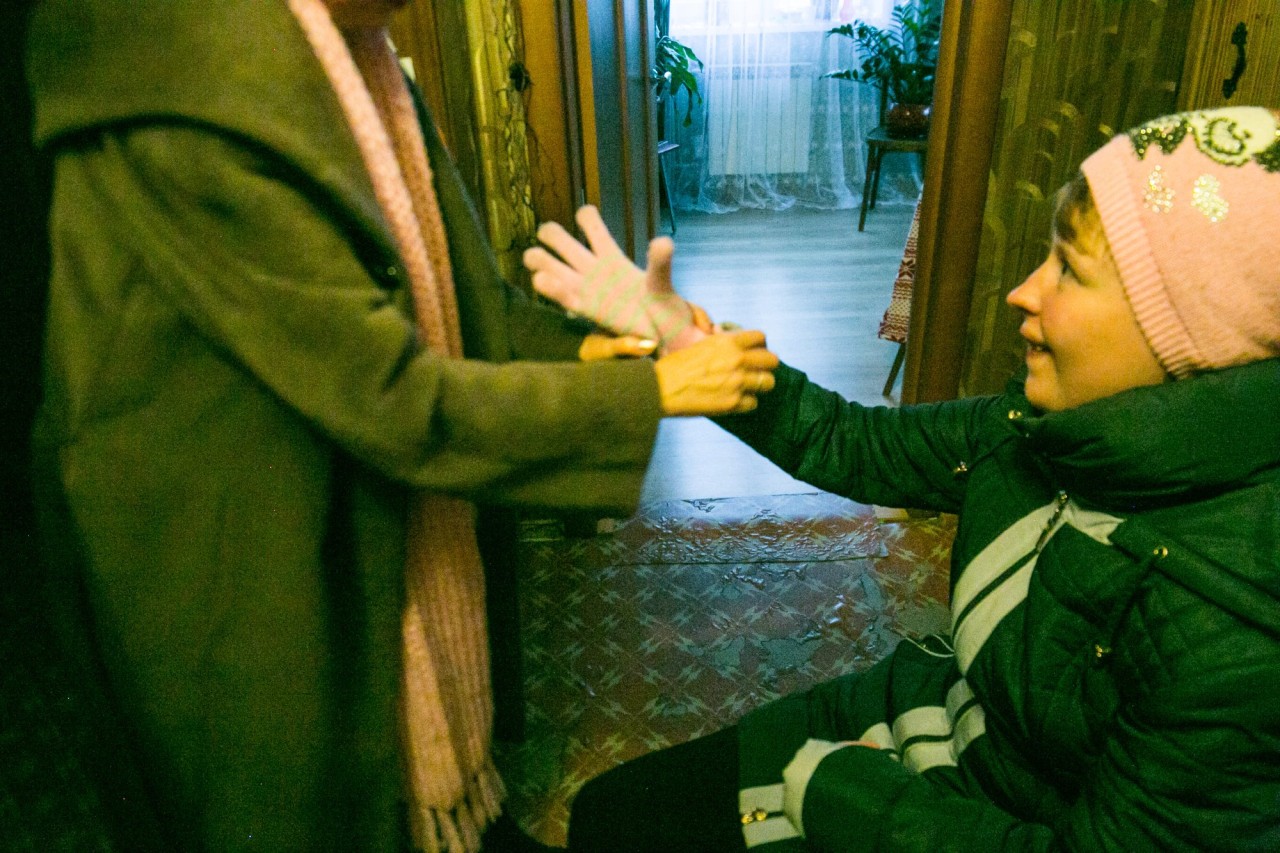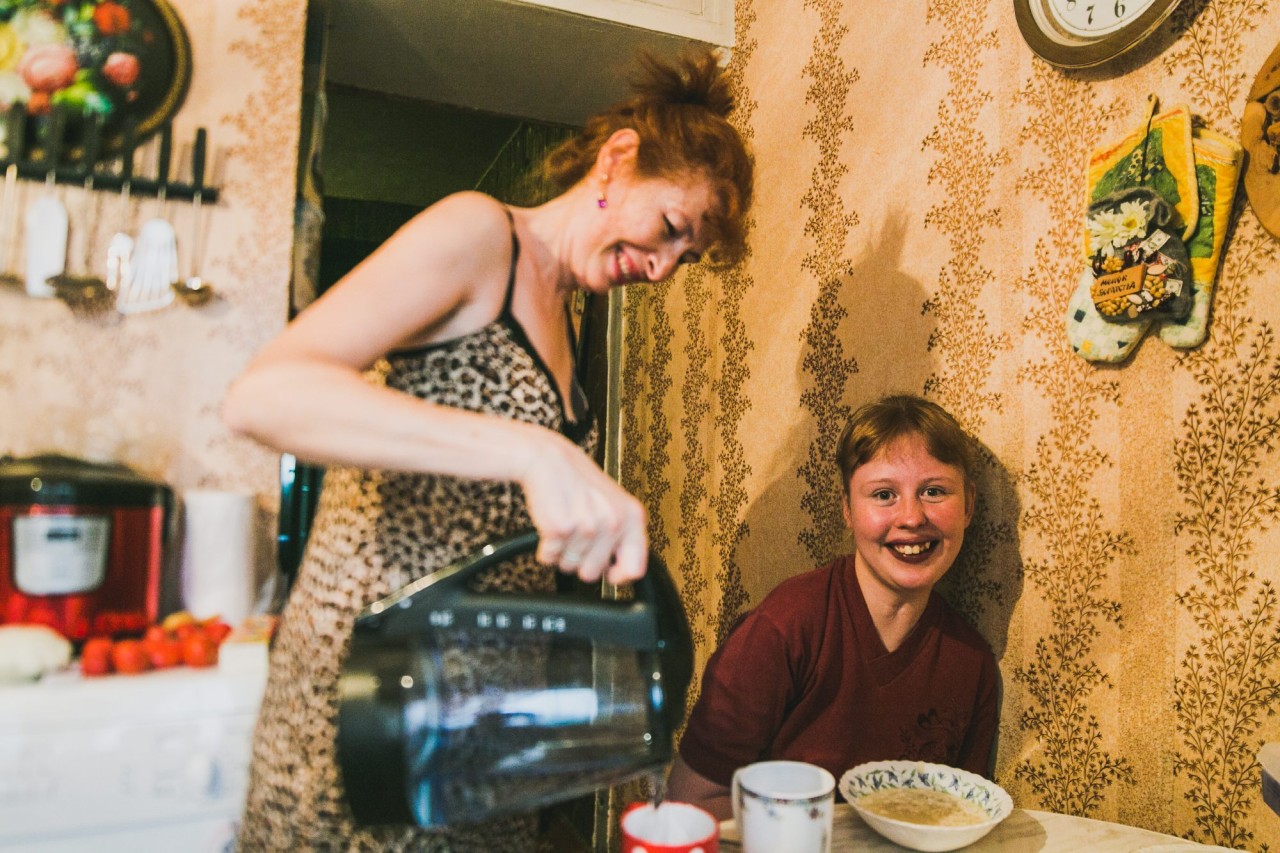 Наташа завтракает. Она сначала пугается, замирает с ложкой овсянки в руке, смотрит очумело. «Это ничего, это мы боимся врачей, — поясняет Ольга. — Туся, кушай. Это просто поговорить». Наташа внимательно изучает меня, принимается медленно черпать кашу. На вид ей лет 14, хотя на самом деле 20. Длинные русые косы, полные губы, пухлые щеки, большие удивленные глаза, Наташа — классический типаж русской красавицы из фильмов про войну. У Наташи тяжелая форма умственной отсталости. Всю ее перекосило немного, двигается она с трудом и почти не говорит, выдает гортанные звуки, которые прекрасно понимает мама. На слух новичка нет разницы между «да» и «чай», для Ольги отличие очевидно.