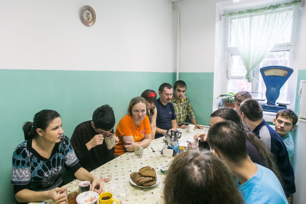 Алеша, Максим, Данила и Коля помыли руки и готовы пить чай. Центр «Надежда» — уникальный проект не только для Иркутской области, но и для всей России. В отличие от западных стран, где стараются бороться с системой интернатов, переориентируясь на помощь семьям, в России нет ни одной государственной программы помощи людям с тяжелыми формами умственной отсталости. При обнаружении проблем в развитии российские врачи по-прежнему советуют родителям отказываться от детей, в то время, как во многих развитых странах, наоборот, родителям оказывают психологическую помощь, убеждая сохранить ребенка, обещая помощь от государства. Российских отказников помещают в специальные интернаты, к примеру, в Иркутске их два общей численностью порядка 600 человек.