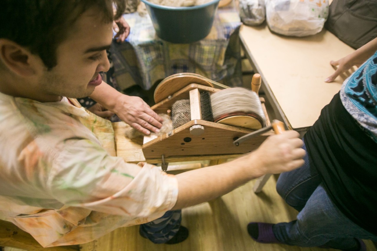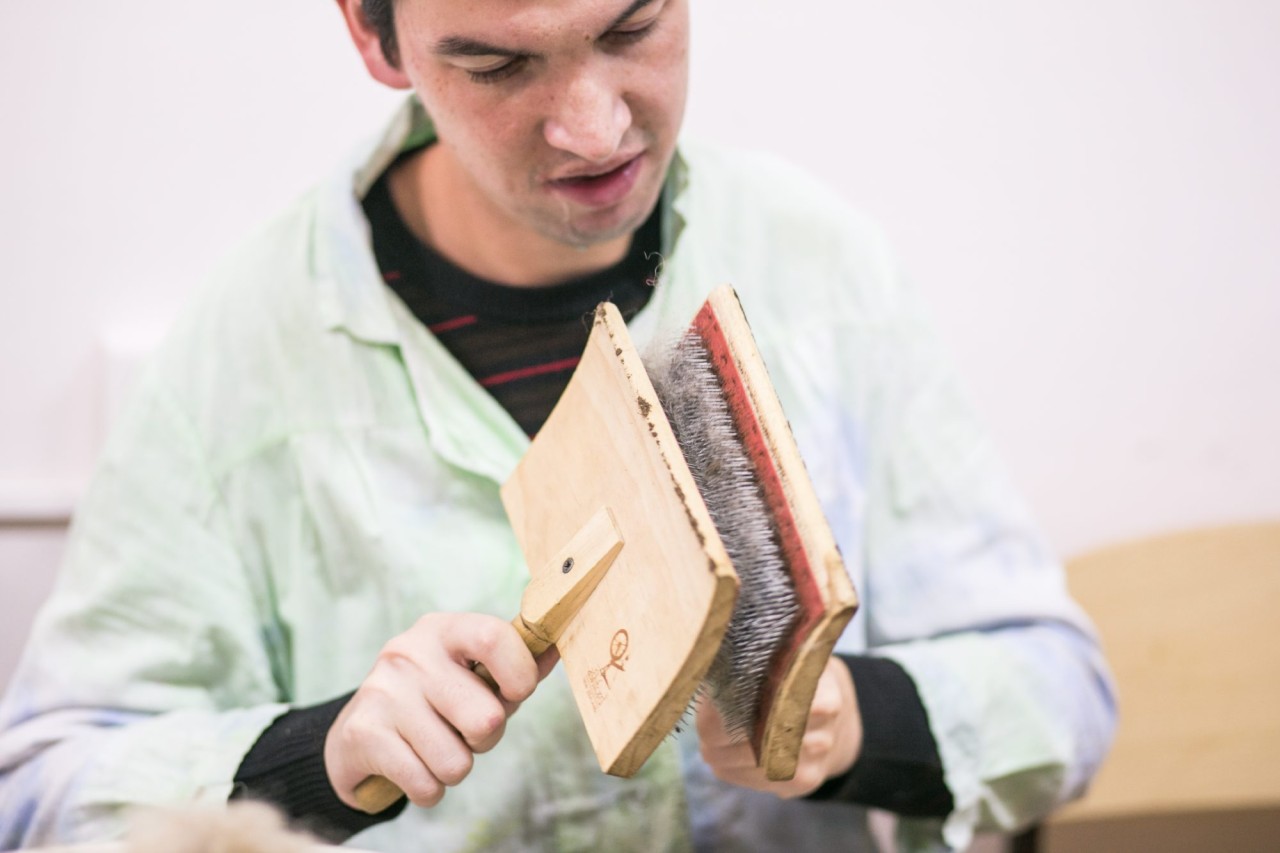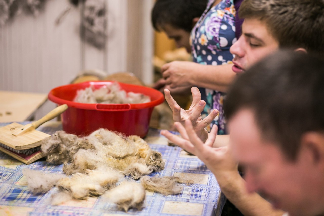 А на кухне полным ходом идет стряпня: Лена натирает морковь, ей помогает педагог Ирина Чупрунова, на обед сегодня гороховый суп и пицца. Готовка — тоже часть обучения, у девушек кулинария по средам, у ребят по пятницам. «Конечно, полностью они сами ничего сделать не могут, — говорит Ирина. — Все поделки — совместная работа с педагогом. Но они знают, из чего состоит борщ, какие продукты надо купить в магазине, как обращаться с посудой». По средам в «Надежде» валяние — студенты делают половики и шерстяные вещи, каждый день после обеда — полиграфия — мастерят открытки, блокноты, продают их потом на ярмарках, дарят ветеранам. Летом устраивают выезды на природу, зимой — праздники вместе со студентами местного педагогического института, будущими дефектологами. В летние лагеря ездят и Ольга с Наташей.