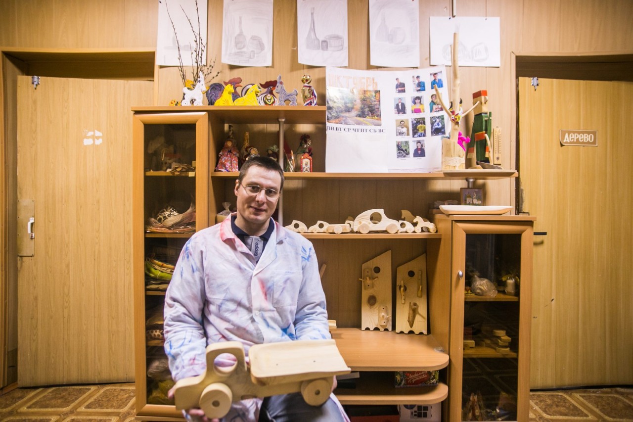 Татьяна Федорова на рабочем месте.Фото: Антон Климов для ТД В «Надежде» пока 11 «детей» и семеро педагогов, но это вовсе не школа. «Мам, я на работе», — отчитывается по телефону Максим. «Мы их приучили, что они взрослые люди и ходят на работу, как все», — объясняет председатель «Надежды» Татьяна Федорова, ее сын Данила, аутист, тоже ходит в «Надежду». Здесь у каждого свое занятие. Радик обшивает нитками шерстяной мячик, Настя вышивает на пяльцах, Максим, Саша и Сергей сидят в деревообрабатывающей мастерской и шлифуют наждачной бумагой выпиленные из дерева болванки: получаются машины, автобусы, пирамиды. Максим может сделать машину за пару дней, Саше на такую же требуется месяц, он выходит со мной в коридор, демонстрирует свою последнюю поделку и сообщает, что Максим — его лучший друг, но они поссорились, потому что Максим обиделся, что Саша ему не звонит. 24-летний Саша — олигофрен, его поначалу тоже сложно понимать, но он очень разговорчив, так что быстро привыкаешь и слушаешь про тигров в цирке, про девочку Машу из той же «Надежды», про то, как ходил на концерт любимого Григория Лепса, но ушел — из-за слишком громкой музыки заболели уши. «Я на него в суд подам. В милицию заявление напишу. Я этого Лепса убью. В суд на него подам. Я его песни обожаю. В суд подам на него», — трясет кулаками Саша, но смеется при этом — он очень добрый, отзывчивый мальчик, никого убивать не собирается, просто выражает свои эмоции при помощи услышанных на улице слов.