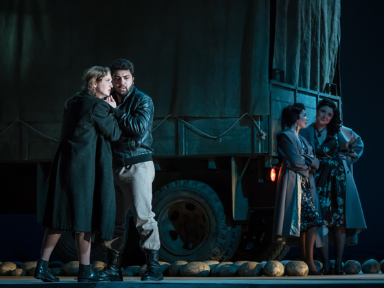 © Сергей Гутник Во-вторых, деликатно стилизованное винтажное очарование, в котором хорошо себя чувствуют Титель и его постоянный партнер, сценограф Владимир Арефьев, тут оказалось очень уместно. Действие происходит в некоем южном европейском городке в послевоенное время. Жарко, киоск с водой, женщины не слишком одеты, но по особым случаям носят цветастые приталенные юбки из эпохи 50-х, мужчины грубоваты, сплошная пропаганда курения. Декорации не замусоривают сцену, все очень веско, крупно и атмосферно. Поочередно появляются три средства наземного транспорта в натуральную величину. Броневик — это тень недавней войны. Трамвай — мирная жизнь. Грузовик — контрабандный хаос.