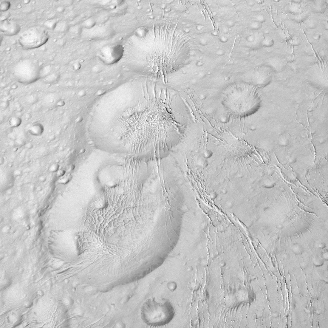 Ученые ожидали, что этот регион будет испещрен кратерами. Но на фотографиях также оказалась сеть тонких расщелин, проходящая по поверхности и рассекающая кратеры.