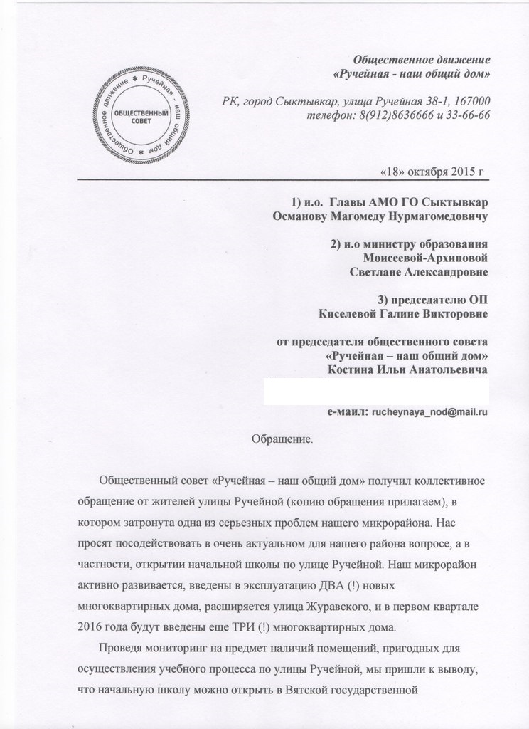 Председатель общественного движения Илья Костин обратился с открытым письмом в администрацию города, министерство образования Коми и в Общественную палату региона.