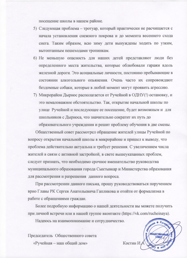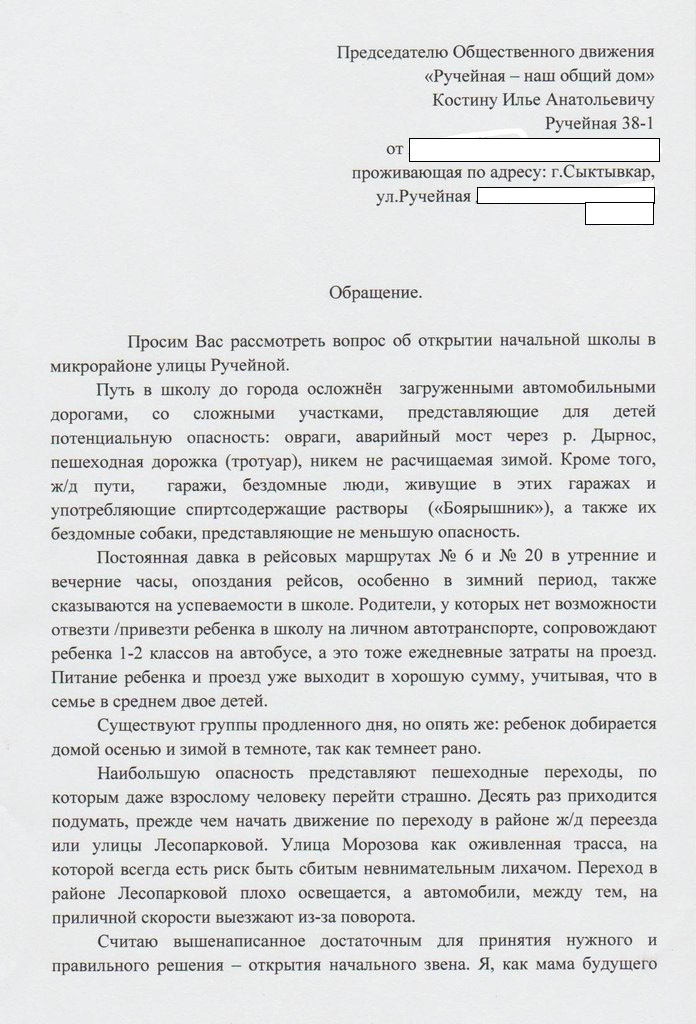 Жительница улицы Ручейная в Сыктывкаре обратилась к председателю общественного движения «Ручейная — наш общий дом» Илье Костину с просьбой посодействовать в открытии в микрорайоне начальной школы.