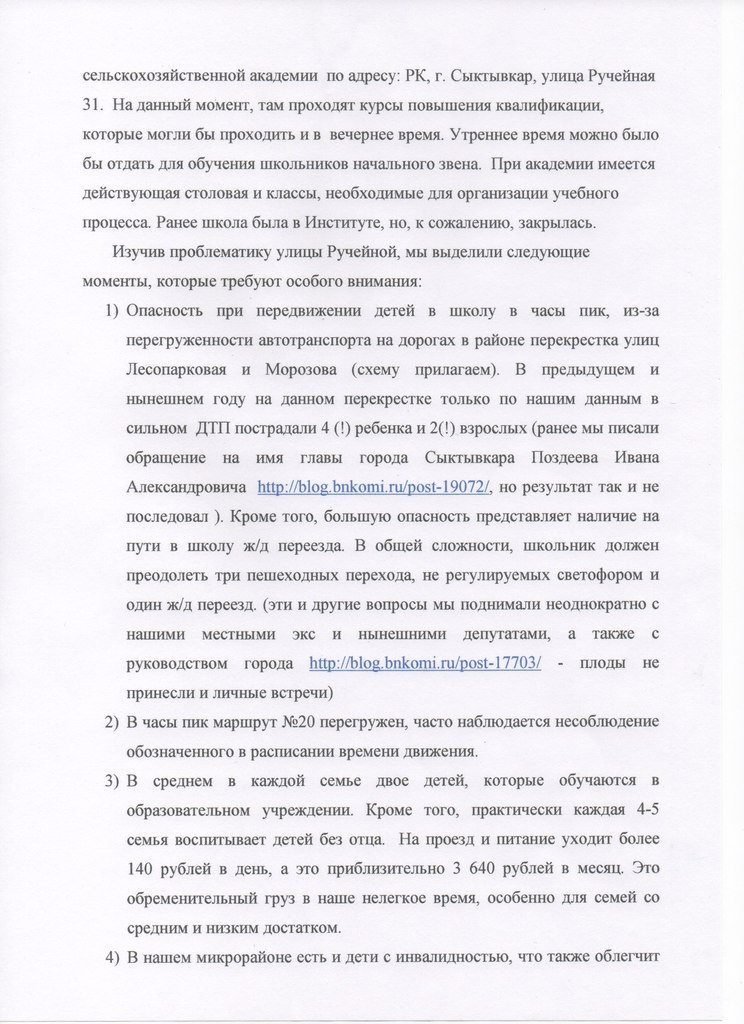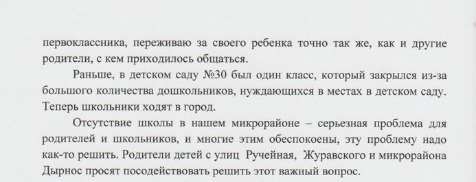 Девушка подчеркивает, что жители микрорайона испытывают сложности с общественным транспортом в утренние часы, когда отвозят детей в школу (опоздание автобусов и давка). Кроме того, на дорогах к улицам Ручейная, Журавского и района Дырнос нет пешеходной инфраструктуры, поэтому родители опасаются за то, что их детей может сбить машина.