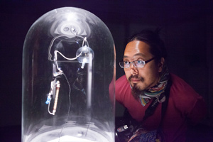 © Tom Mesic Chijikinkutsu / Нело Акамацу Среди представленных проектов — победитель в номинации sound-art, японский художник Нело Акамацу с саунд-инсталляцией «для традиционных японских садов» Chijikinkutsu, где множество стаканов с водой выстроены в определенный паттерн, внутри каждого стакана — намагниченная иголка, которая издает звон о бортик стакана, когда электромагнитное поле изменяется. Этот проект перекликался с работой другого японского художника, показанной на основной площадке в рамках Post City Kit. Соитиро Михара представил стеклянный хрупкий купол-объект: внутри него расположен микрочип, измеряющий уровень радиации, который соединен с китайским колокольчиком внутри купола; чем выше радиация — тем чаще раздается мелодичный звук, несоотносимый с опасностью.