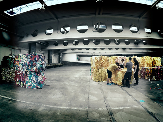 © Анна Титовец Команда обсуждает, что делать с переработанными кубами бумаги, из которых впоследствии должны быть построены стены, столы и стулья Post City