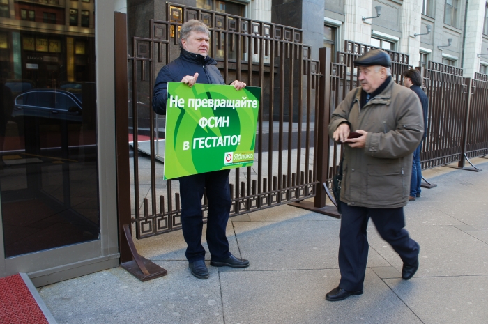 Участвовавший в акции председатель партии Сергей Митрохин заявил: "Мы вернулись в 30-е годы во времена НКВД и гестапо, которые друг от друга ничем не отличались". Лидер ЯБЛОКА отметил, что этот закон фактически развязывает руки сотрудникам ФСИН для расправы над заключенными по ничтожным поводам, будь то неправильно заправленная кровать, курение в неположенном месте и прочее.