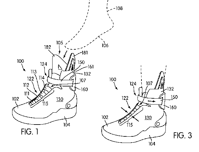 В патенте описано, что кроссовки закрепляют ногу в двух местах. Первый зажим фиксирует лодыжку.