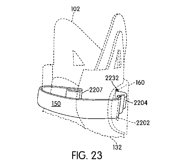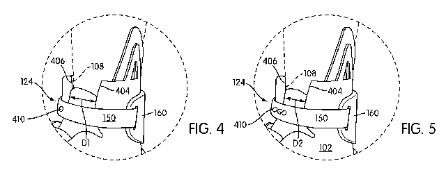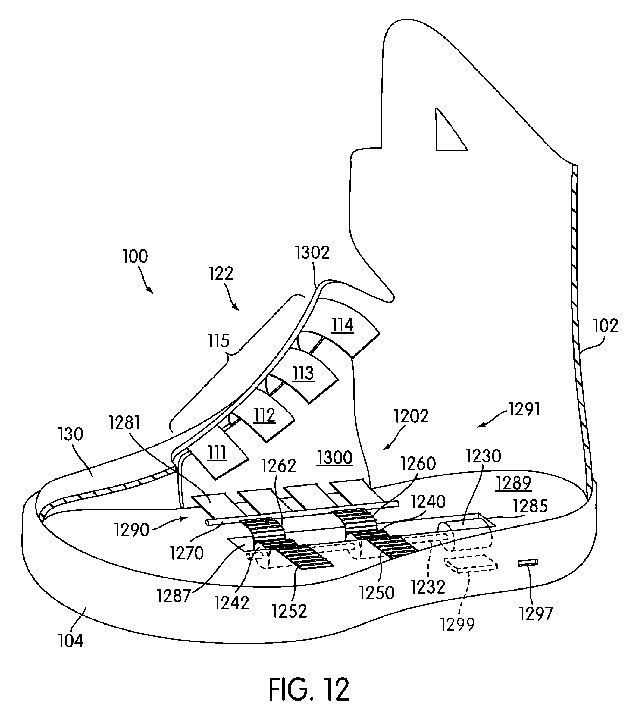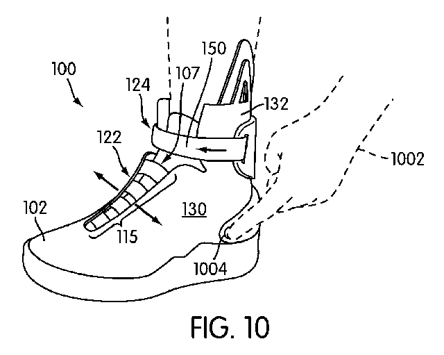 И снова фиксация лодыжки: в патенте говорится, что ремешок будет сам вставляться в нужный паз. Когда ремешок расслаблен, стопа должна свободно проходить через отверстие. А стоит просунуть ногу, как сенсор подаст команду ботинкам затянуть шнурки