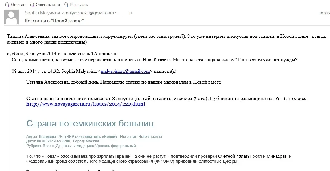 В этой публикации среди писем о размещении материалов с данными проверок Счетной палаты в различных СМИ есть и про нас. Это переписка Голиковой со своей помощницей о статье в «Новой газете», опубликованной в августе 2014 года: «Страна потемкинских больниц».