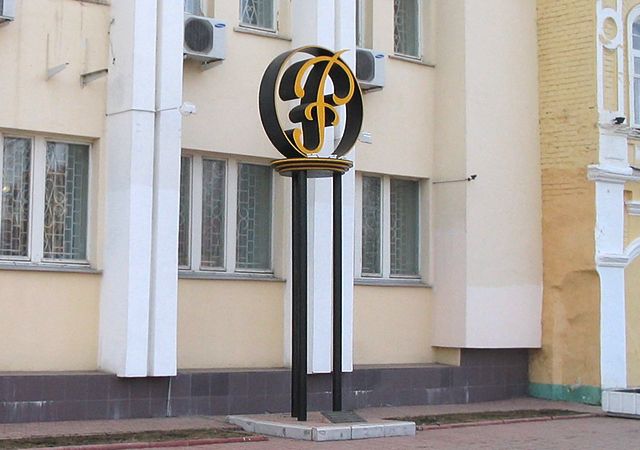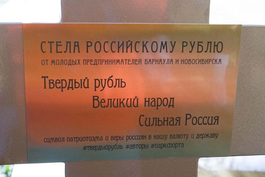 23 октября в Барнауле открыли памятник рублю — двухметровый монумент в форме графического обозначения валюты ₽. Рубль сделан из железа и покрыт золотистой краской.