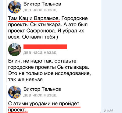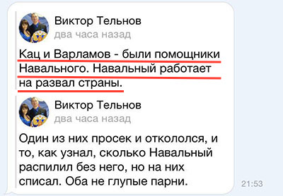 Настоящая же причина, как следует из выложенной переписки, — в руководителях «Городских проектов». Проект возглавляют Варламов и московский муниципальный депутат Максим Кац. По мнению Тельнова, они оба были помощниками оппозиционера Алексея Навального, который «работает на развал страны». «С этими уродами проект не пройдет», — пишет чиновник.
