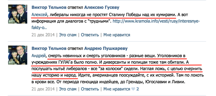 Удивила Варламова и многогранность личности Тельнова: «Одной рукой размещает проповеди Патриарха Кирилла, другой поддерживает Сталина. Иногда любовь к вождю буквально прорывается сквозь оковы терпения. Несколько лет назад, тогда еще Тельнов служил в администрации Ухты, он бесцеремонно вступил в спор о сталинских репрессиях и заявил буквально следующее: