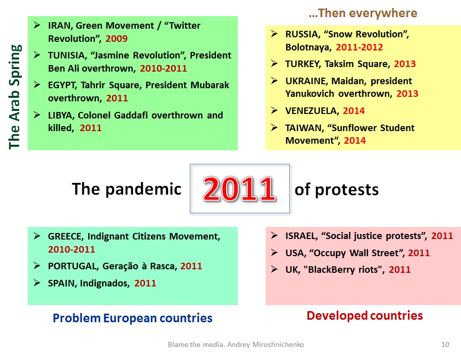 Первая важная деталь, которую всегда упускают как апологеты, так и критики понятия «твиттер-революция»: в 2011—2012 годах, то есть примерно в конце первой декады распространения соцсетей, волна протестов прокатилась по всему миру, не обойдя и благополучные страны, даже США (Occupy Wall Street). Нечто общее спровоцировало протесты образованной молодежи практически везде, включая вотчину самого Госдепа (миф о руке Госдепа, кстати, даже его критикам мешает увидеть сходство протестов в Каире, Москве и Нью-Йорке). И это общее, конечно же, вовсе не формирование среднего класса. Я собрал и сгруппировал для наглядности наиболее резонансные протесты этой волны в абсолютно разных по устройству и благополучию странах. Безусловно, в каждом случае есть свой национальный колорит и нюансы — но есть и общее.