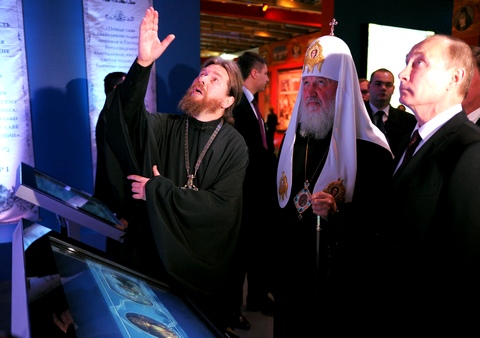 Фото: Россия. Москва. 4 ноября. Настоятель Сретенского ставропигиального монастыря архимандрит Тихон (Георгий Шевкунов), патриарх Московский и Всея Руси Кирилл и президент России Владимир Путин (слева направо) во время посещения интерактивной выставки "Православная Русь. Романовы", посвященной 400-летию императорской династии, в ЦВЗ "Манеж". Фото Алексей Никольский/ТАСС