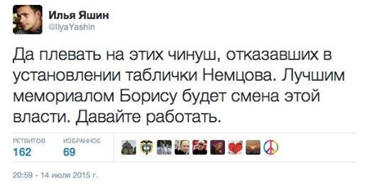 Ilya Yashin, the deputy chairman of the opposition party Parnas, announced today that an anti-extremism task force in the Russian Interior Ministry is investigating one of his tweets from July 2015. Yashin is suspected of inciting "social discord" by writing that the "best memorial to Boris [Nemtsov] would be regime change."