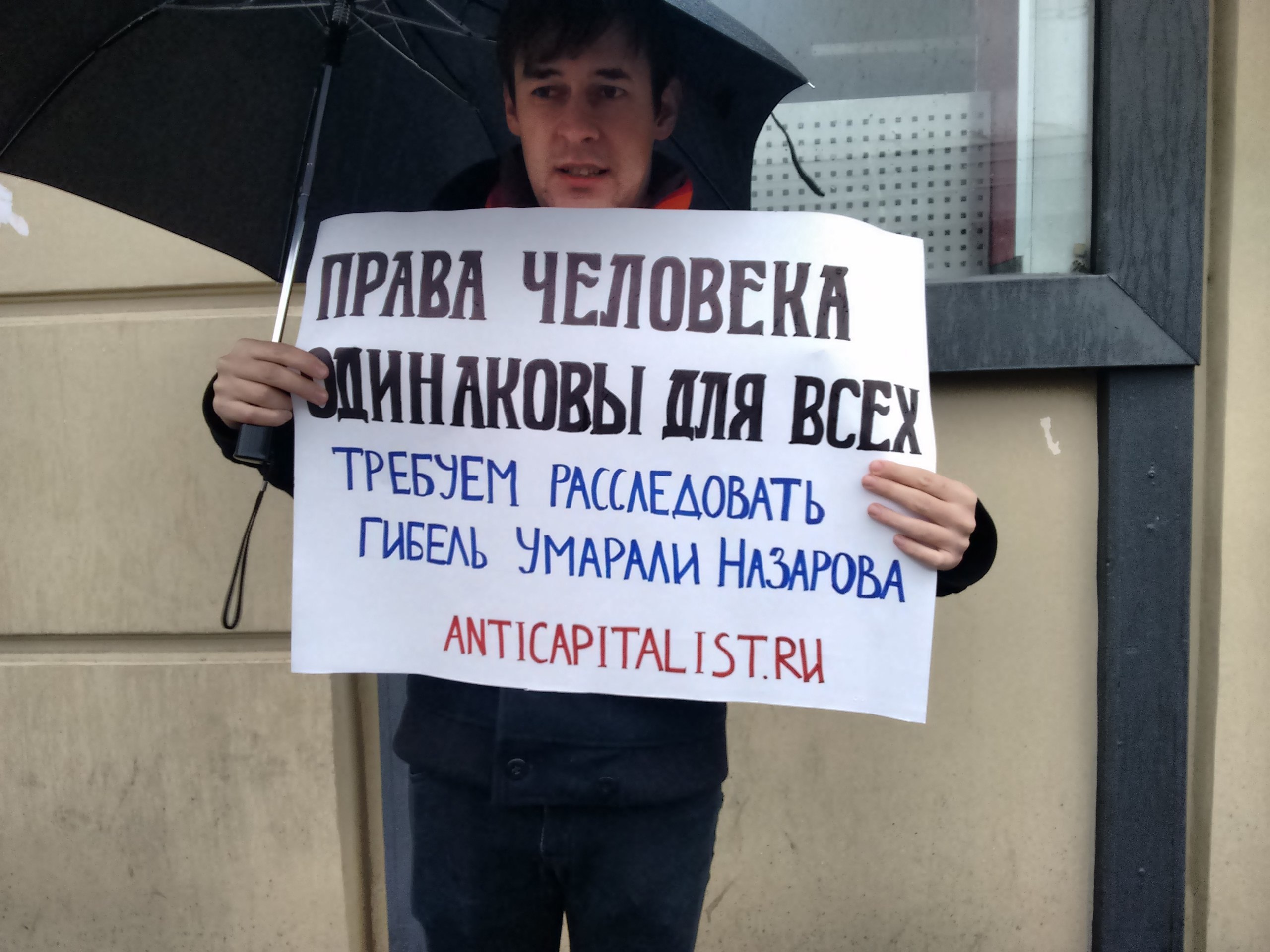 Как передает корреспондент Радио Свобода Татьяна Вольтская, около полутора десятков активистов Российского социалистического движения вышли вечером 27 октября на Садовую улицу. Они провели серию одиночных пикетов, целью которых было рассказать горожанам о смерти Умарали Назарова , которого в полицейские отняли у матери, обвиненной в нарушении миграционного законодательства, и отправили в Центр медицинской и социальной реабилитации детей, оставшихся без попечения родителей, где ребенок в ту же ночь умер. В руках у активистов были плакаты: «Нет расизму и жестокости полиции», «Права человека одинаковы для всех», «Ребенок не знает гражданства и расы».