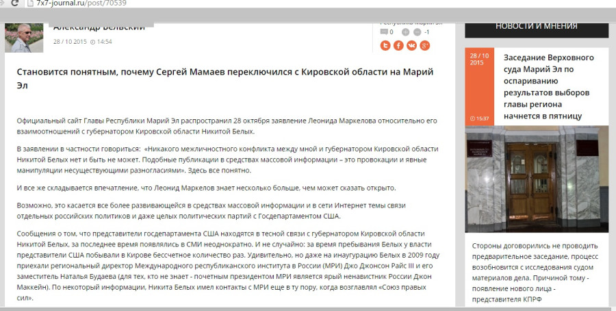 Правительственная газета “Марийская правда” опубликовала 28 октября заявление главы республики Леонида Маркелова относительно его взаимоотношений с губернатором Кировской области Никитой Белых. В заявлении в частности говориться: «Никакого межличностного конфликта между мной и губернатором Кировской области Никитой Белых нет и быть не может». И в этот же день “карманные” журналисты главы Марий Эл публикуют материалы о связях губернатора Кировской области с Государственным департаментом США.