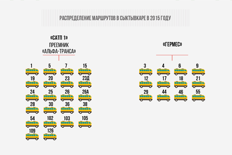 При этом учредителями «СыктывкарГорТранса» стали четыре компании. Названия трех из них — «Курс», «Рейс» и «ЭСКОРТ» — мало что говорят читателям. Но четверым учредителем стало ООО «Гермес», которое, вероятнее всего, стало влиять на распределение маршрутов.