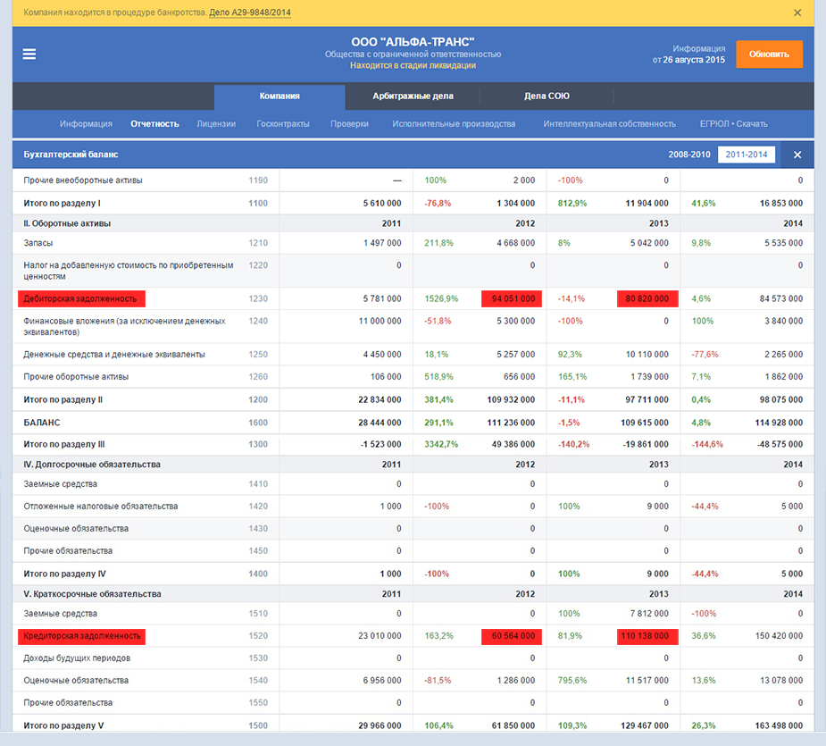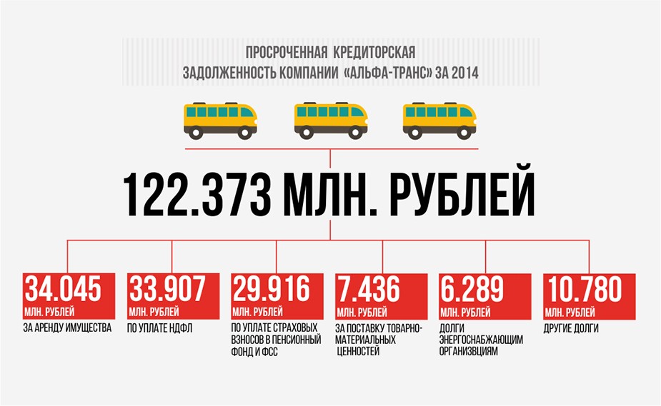 Показательно, что именно в 2013 году финансовые показатели «Альфа-Транса» резко ухудшились. Если в 2012 году дебиторская задолженность (то, что контрагенты должны «Альфа-Трансу») равнялась 94,051 млн рублей, то в 2013 она снизилась до 80,820 млн рублей. При этом кредиторская задолженность предприятия (то, что должна по обязательствам сама компания «Альфа-Транс») увеличилась с 60,564 млн рублей в 2012 году до 110,138 млн рублей в 2013 году.