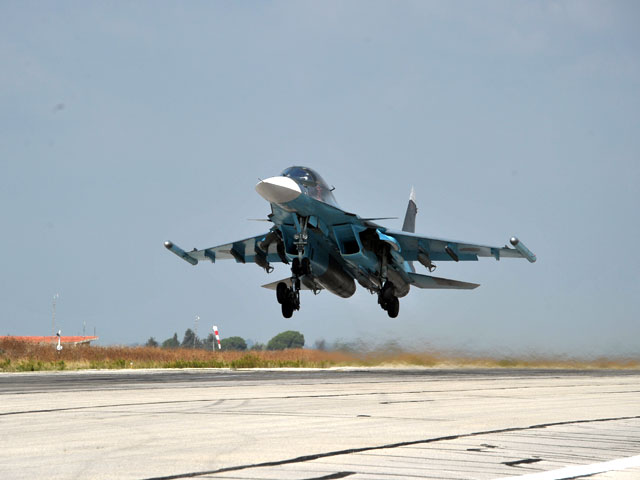 Самолет Су-34, оборудованный на глазах сотрудников СМИ, вылетел на задание на восток Сирии, где располагаются позиции террористов. Вместе с ним в воздух поднялся истребитель Су-30СМ.
