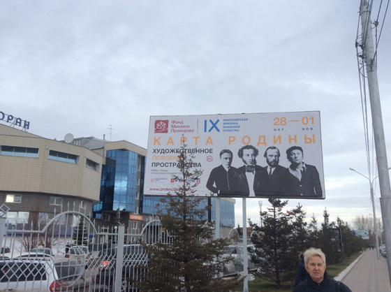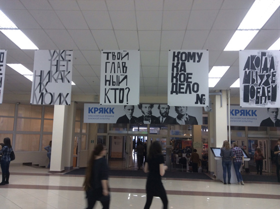 © Сергей Сдобнов Центральная тема КРЯКК 2015 года — «Карта Родины: художественное освоение пространства». С одной из сцен слышно, как «советский археолог рассказывал об уничтожении советских археологов и случайно упомянул про вырезание всех советских краеведов в 37-м году». Рядом со стендом детского издательства «Поляндрия» произносят: «У нас ничего нет для подростков — могу показать вам смысл жизни и отправить к “Розовому жирафу” и “Самокату”». В холле КЦ «Сибирь» висят плакаты студентов В. Меламеда и не только. Подробнее можно посмотреть тут (куратор проекта — Андрей Логвин). Первый вывод — посетитель попадает в пространство историй. Его постоянно преследуют обрывки диалогов, лекций, ситуаций, сразу понятна фрагментарность жизни.