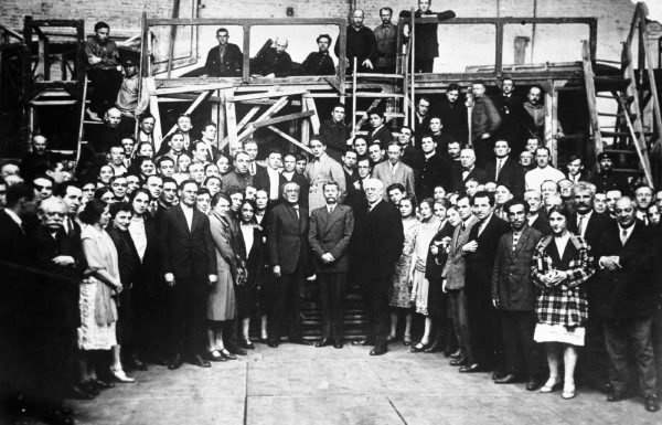 Около пяти часов вечера к театру стали съезжаться заказанные ранее такси и выстраиваться вдоль тротуара против театра. У ворот сразу образовалась толпа зевак. Во дворе был установлен прожектор, протянута гирлянда от артистического подъезда до соседнего лома. Фасад театра иллюминован гирляндой лампочек; около подъезда бельэтажа — огромное знамя, которое ставилось в прошлом году в октябрьские торжества. В шестом часу у театра стали выходить парами депутаты, артисты с букетами («Как на свадьбе» — сказала при выходе А.К. Тарасова) и садились в такси: поехали за юбилярами. Толпа у ворот все возрастала. Вскоре такси стали уже возвращаться. Всех приезжающих публика на улице у ворот встречала аплодисментами и криками «ура». Особенно восторженно приветствовали приезд К.С. и Вл. Ив. Во дворе юбиляров встречала музыка. Погода была сухая, прохладная. К семи часам съезд закончился, но торжественное заседание еще не начиналось, так как не было А. В. Луначарского. Наконец он приехал.