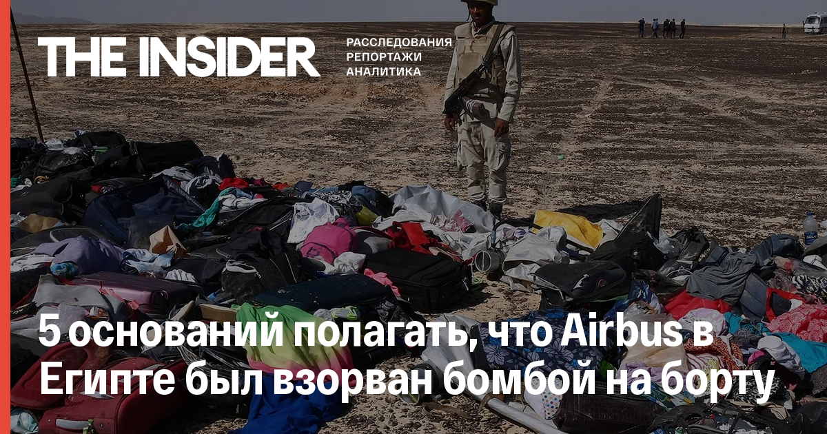 В последние дни поступает все больше противоречивой информации об обстоятельствах крушения Airbus с российскими туристами в Египте. Сегодня уже, впрочем, эксперты пришли к консенсусу по поводу некоторых из установленных фактов, исходя из которых можно сделать вывод – одной из основных версий крушения самолета является взрыв бомбы на борту самолета. The Insider приводит 5 ключевых аргументов, подтверждающих эту версию.