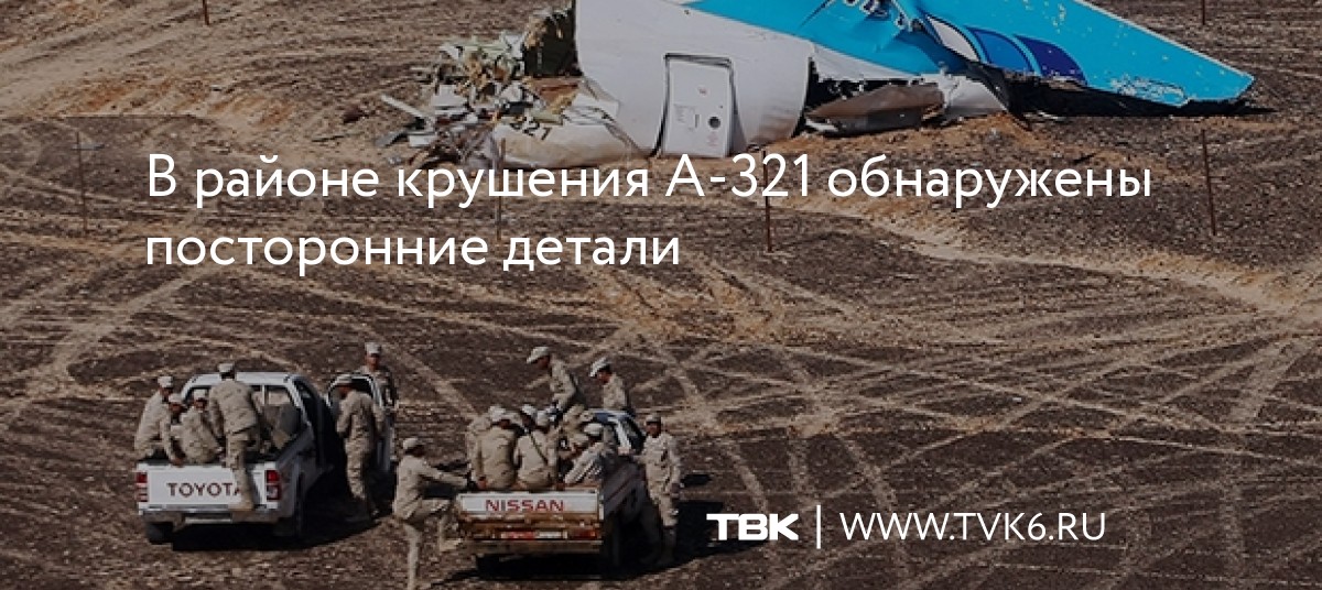 Что это за элементы агентство не уточнило, сообщив только, что они направлены на экспертизу. Однако официально эта информация пока не подтверждена.ТАСС, со ссылкой на свои источники в Каире, сообщает сегодня, 3 ноября, что на месте крушения лайнера А-321 «Когалымавиа» были найдены не относящиеся к конструкции самолёта элементы.