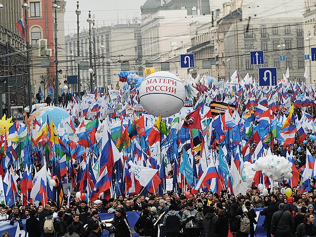 В первых рядах колонны следуют представители традиционных российских конфессий. В акции принимают участие активисты Московской федерации профсоюзов, различных политических партий и общественных организаций, пишет "Российская газета". Демонстранты, среди которых много студентов, несут плакаты: "Все за Россию, Россия за всех!", "За единство от Камчатки до Крыма", "Когда мы едины - мы непобедимы!".