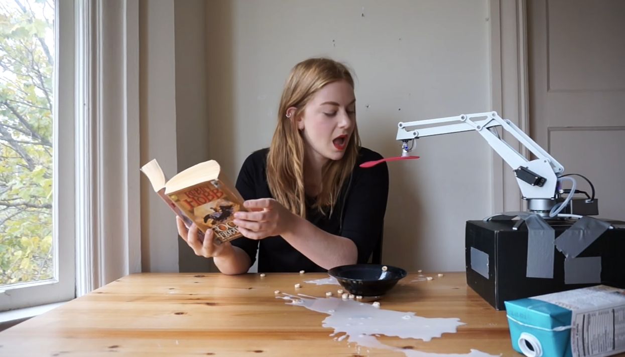 План изобретательницы состоял в том, чтобы взять роботизированную руку и научить ее заливать хлопья молоком и кормить хозяйку ложкой.