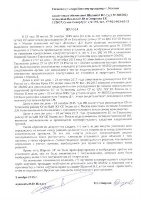 Адвокат Иван Павлов 5 ноября пожаловался в Таганскую районную прокуратуру на грубые нарушения при возбуждении уголовного дела на директора Библиотеки украинской литературы Наталью Шарину. Копия жалобы опубликована на его странице в Facebook.