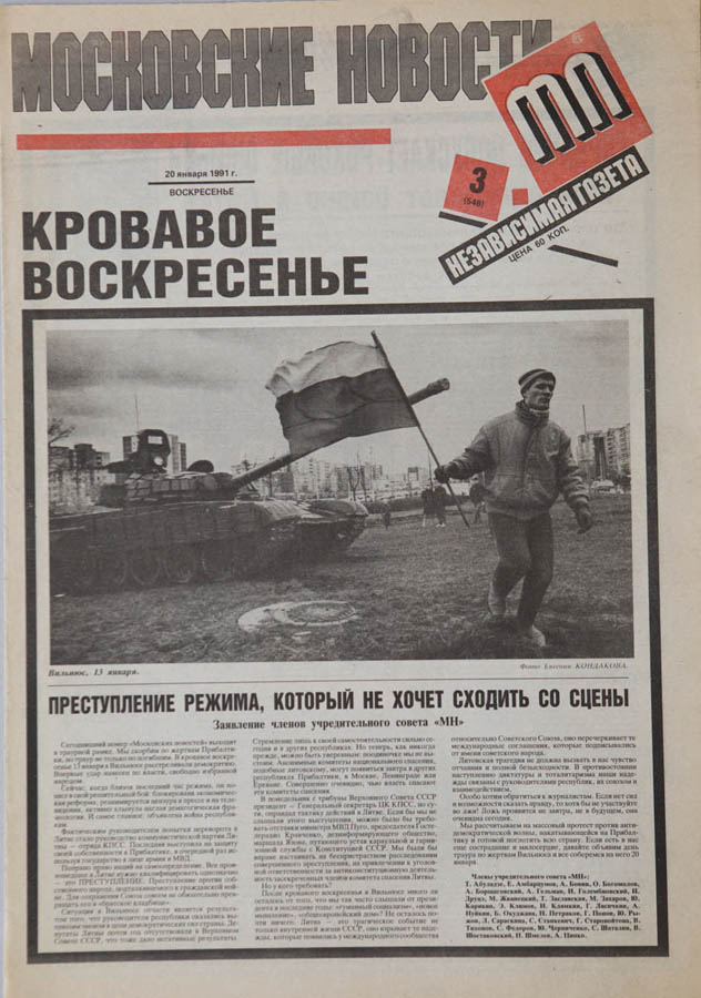 – Вернуться в Москву – это была отдельная сложность. На вокзалах Вильнюса были военные патрули, и я опасался за отснятые фотопленки. Для того, чтобы успеть "в номер", я должен был доставить пленку в Москву, ведь цифровые технологии появились лет через 10 после вильнюсских событий. Чтобы не привлекать внимания спецслужб, опасаясь конфискации пленок, я вынужден был оставить всю аппаратуру у случайных знакомых и на проходящем поезде, в плацкартном вагоне, уехал в Москву. Через день вышла газета "Московские новости" с шапкой "Кровавое воскресенье" и фотографией вильнюсских событий на первой полосе. Сотни людей стояли целый день на Пушкинской площади, у редакции "Московских новостей", и читали этот номер, выставленный в настенных стендах. Через несколько дней в Москве состоялся многотысячный митинг в поддержку литовцев. Часть тиража с помощью пилотов "Аэрофлота" переправили в Вильнюс, газету распространяли на баррикадах вокруг парламента… А фототехнику мне передали через несколько дней, имен этих людей я даже не знаю. Но вся техника вернулась ко мне в целости.