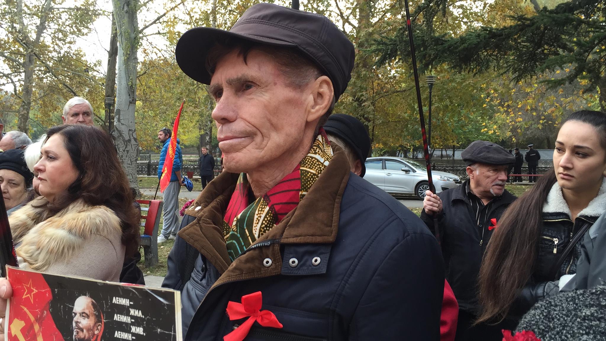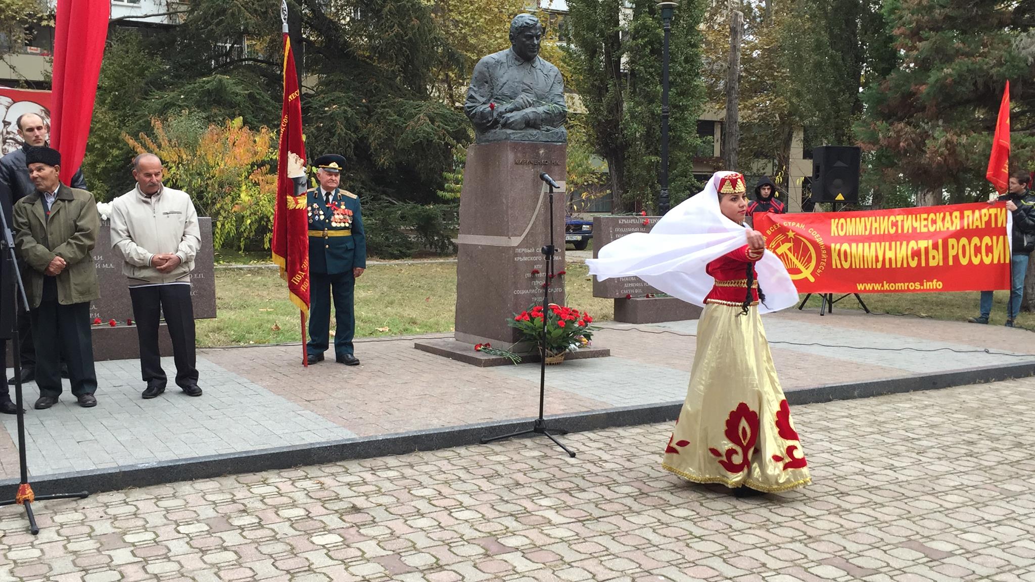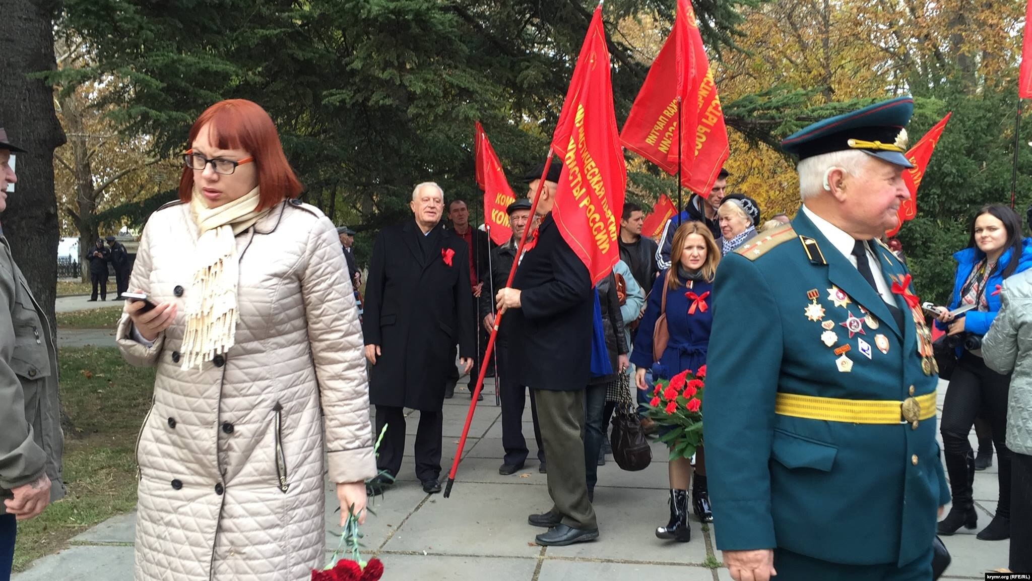 Симферополь – По случаю 98-й годовщины Октябрьской социалистической революции в Симферополе прошли сразу несколько мероприятий. Одно из них состоялось на набережной Салгира в Сквере героев соцтруда, где установлены памятники первым секретарям крымского обкома Компартии Украины Ивану Лутаку и Николаю Кириченко. За тем, как крымчане праздновали «красный день каленларя», наблюдала корреспондент Крым.Реалии.