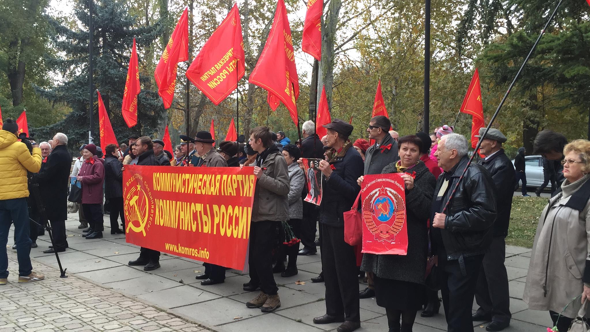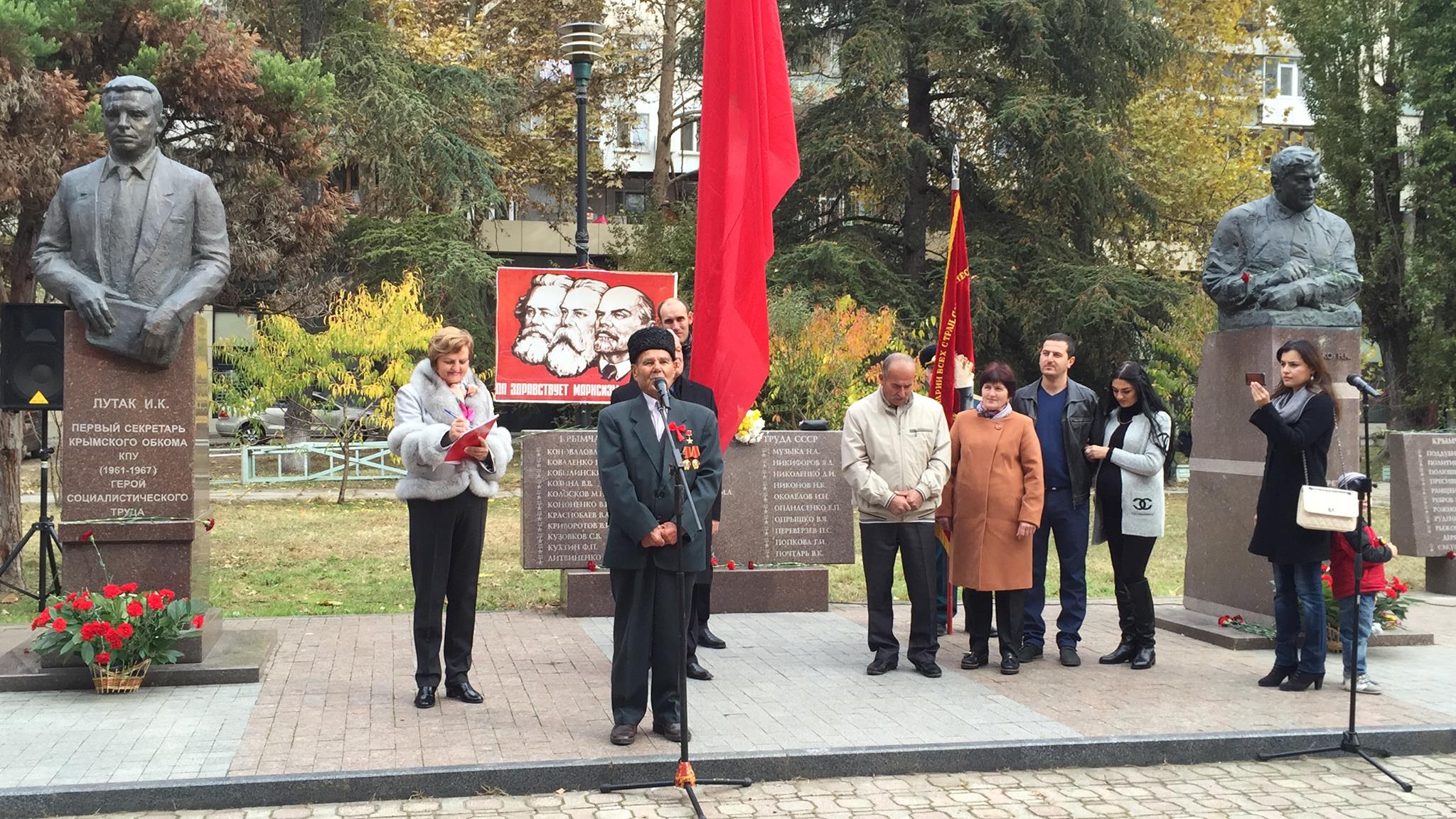 Ближе к 10-ти утра возле памятников советским партийным деятелям на улице Набережной стали не спеша собираться участники митинга, организованного крымским республиканским отделением партии «Коммунисты России». Это были преимущественно люди пожилого возраста. К тому времени некоторые успели занять лавочки напротив так называемого Пантеона трудовой славы, где на стеле выгравированы имена крымских героев социалистического труда СССР. Из динамиков доносилась песня советского прошлого «Есть у революции начало…».