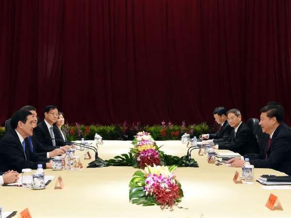 Встреча двух лидеров готовилась несколько лет, но о точной дате и месте журналистов уведомили только во вторник. Си Цзиньпин и Ма Инцзю встретились в отеле «Шангри-Ла» в еще одном преимущественно китайском государстве — Сингапуре во время официального визита туда председателя КПК и Председателя КНР. Встреча задумана была как имеющая символический характер, в ее ходе не предполагалось подписывать никакие договоры. Гораздо важнее, что два лидера на протяжении полутора минут под вспышки фотокамер жали друг другу руки. Их речи были очень неконкретны и наполнены метафорами: «Мы братья, соединенные одной плотью, и даже если наши кости сломлены, наша кровь гуще воды» - заявил китайский лидер. «Китайцы по обе стороны пролива обладают достаточной мудростью, чтобы самим решить свои вопросы» - добавил он.