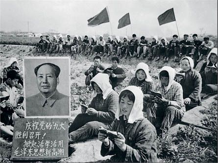 Китайские крестьяне читают «Цитатник» Мао рядом с портретом вождя, уезд Хуньчунь, май 1969 года