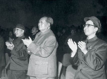 Мао Цзэдун (в центре) с одним из идеологов «культурной революции» Линь Бяо (слева) и со своей третьей женой Цзян Цин, которая лично организовывала отряды хунвейбинов, Пекин, апрель 1967 года