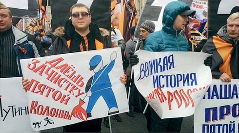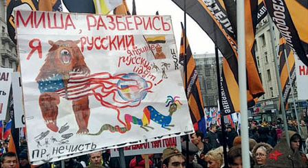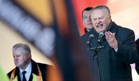 Квинтэссенцией этой «центристской идеологии» можно считать выступление Жириновского на митинге 4 ноября в Москве. «Боже, царя храни! Властвуй на славу нас, царь православный! Союз нерушимый республик свободных сплотила навеки великая Русь!» — прокричал со сцены лидер ЛДПР, слегка перевирая слова старого гимна. «Смута помешала сохранению царской и советской России. Но теперь, осознав наше историческое единство, мы не позволим этому произойти вновь, — наставлял Жириновский зрителей. — Более того, сегодня мы должны быть особенно сплоченными, потому что только русские могут спасти мир. Посмотрите, что творится на Ближнем Востоке. Европа там ничего не решит, она обречена на развал под давлением миллионов мигрантов. Именно мы снова спасем планету, как уже спасли ее от Наполеона и Гитлера».
