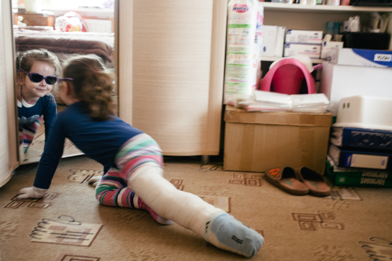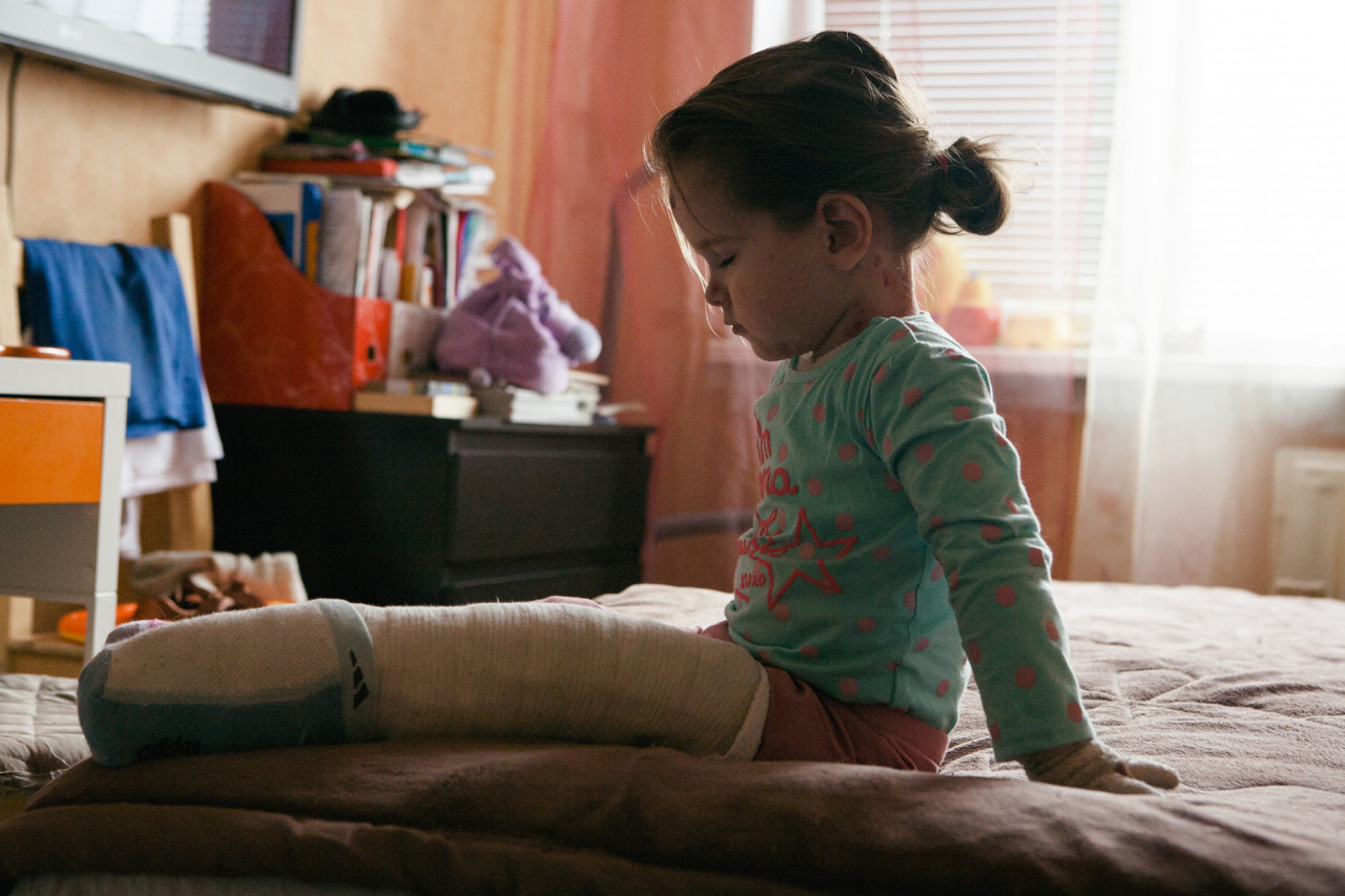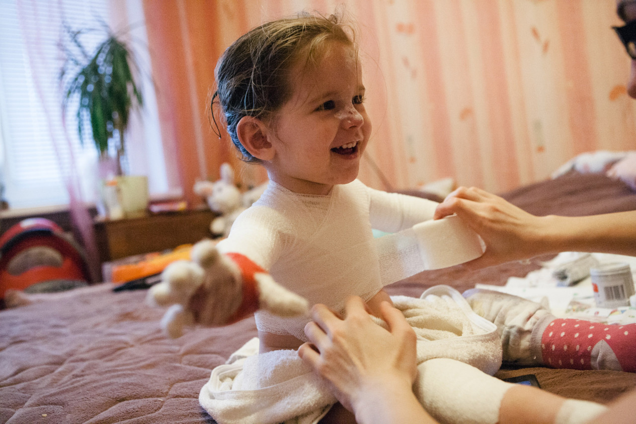 Когда Оля родилась, у нее почти полностью отсутствовала кожа на одной ноге. «В больнице натерпелись всякого, — рассказывает ее мама Даша. — И зеленкой раны мазали, и пластыри отрывали вместе с кожей. Врачи не знали, что с этим делать, специалистов не было. Мужу предлагали отказаться от нас. Сейчас Оле почти четыре года. Оля — маленькая командирша, упертая, упрямая, твердая и очень целеустремленная. Ногтей на руках нет уже давно. Она носит специальные мягкие перчатки. Если этого не делать, кожа будет постоянно травмироваться, и это может привеcти к тому, что пальцы срастутся. Из-за тончайшей кожи на ноге она до сих пор не ходит».