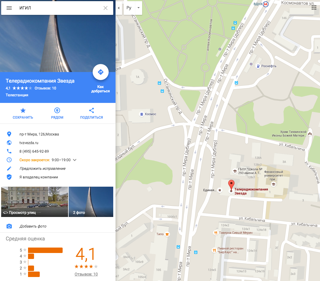 Google Maps says ISIL is located at the Russian Defense Ministry's TV station in Moscow