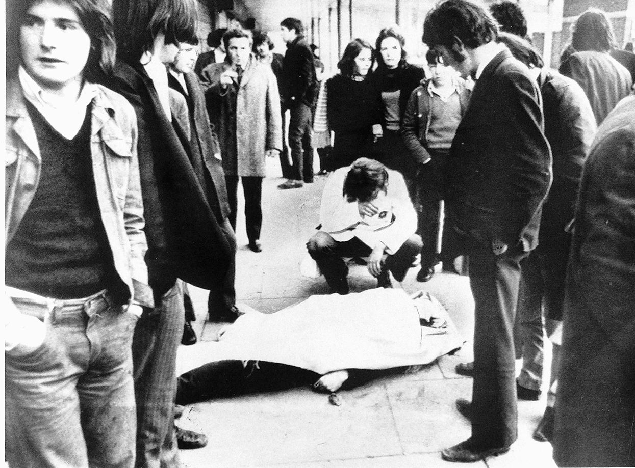 30 января 1972 года в городе Дерри (полное название — Лондондерри) военнослужащие 1-го парашютного полка войск специального назначения Великобритании открыли огонь по демонстрантам, вышедшим на марш протеста. О причинах произошедшего спорят до сих пор, достоверно известно лишь, что военные сделали более 100 выстрелов. 13 человек погибли на месте, еще один скончался от последствий ранения спустя несколько месяцев. Шестеро из погибших были 17-летними подростками. Оружия и взрывчатых веществ ни у одной из жертв «Кровавого воскресенья» не было. По официальной версии британских властей, военные открыли огонь в связи с тем, что им грозила прямая опасность со стороны демонстрантов. Одной из причин кровопролития называли нападение отколовшейся от основного марша группы подростков на полицейских с камнями, однако подобное происходило в то время практически на каждой уличной акции.